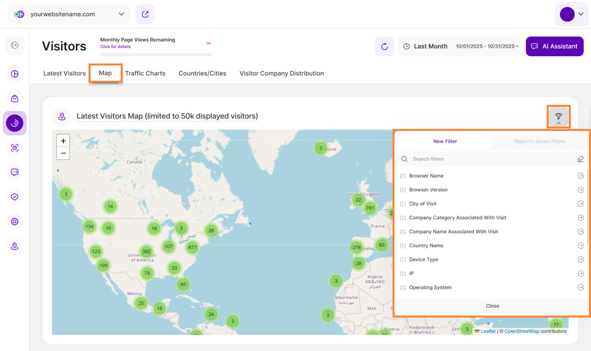 Die Karte der letzten Besucher bietet jetzt mehrere Filteroptionen, die Sie einzeln oder in Kombination verwenden können, um die Daten zu verfeinern und Ihre Analyse auf bestimmte geografische Regionen zu konzentrieren.