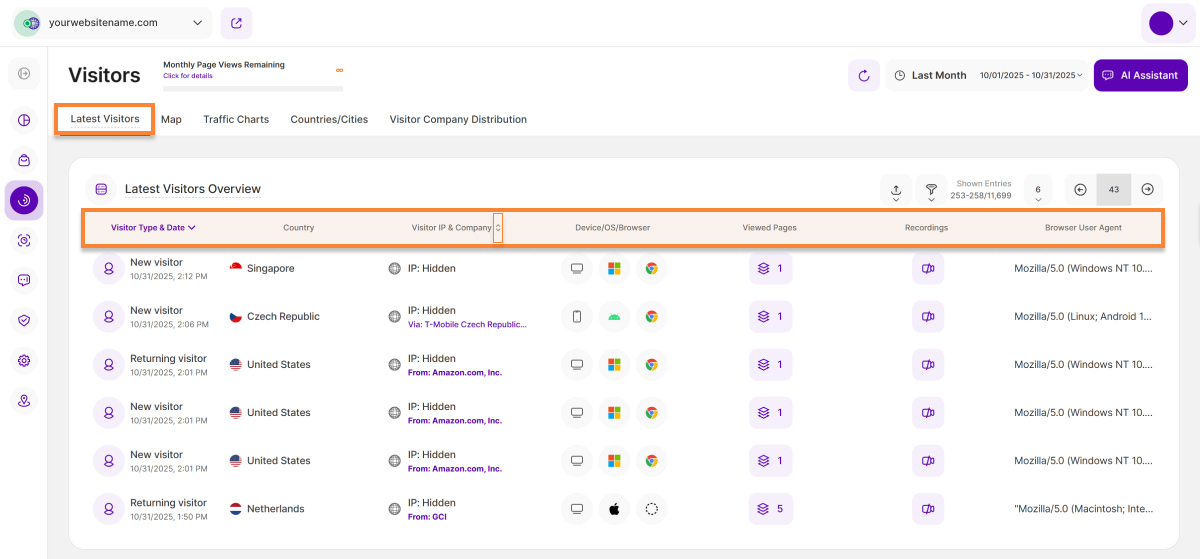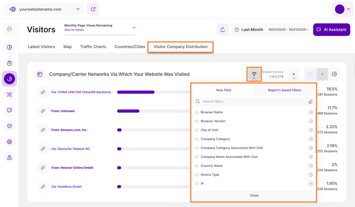 - Besucher IP & Unternehmen: Zeigt die eindeutige IP-Adresse an. Sie können diese Spalte jetzt ganz einfach sortieren, indem Sie auf die Spaltenüberschrift klicken. Wählen Sie zwischen aufsteigender und absteigender Reihenfolge. Hinweis: Die Funktion Unternehmensnamen von Besuchern ist verfügbar, wenn Sie das Preispaket mit Mindestumsatz abonniert haben. Mit dieser Funktion werden IP-Adressen mit firmeneigenen Bereichen verglichen: Wenn eine Übereinstimmung gefunden wird, wird der Firmenname angezeigt; andernfalls wird nur der Internetdienstanbieter (ISP) angezeigt. Bewegen Sie den Mauszeiger über den Firmennamen oder den ISP, um die Gesamtzahl der Seitenaufrufe anzuzeigen, die von dieser IP-Adresse innerhalb des ausgewählten Zeitraums stammen.