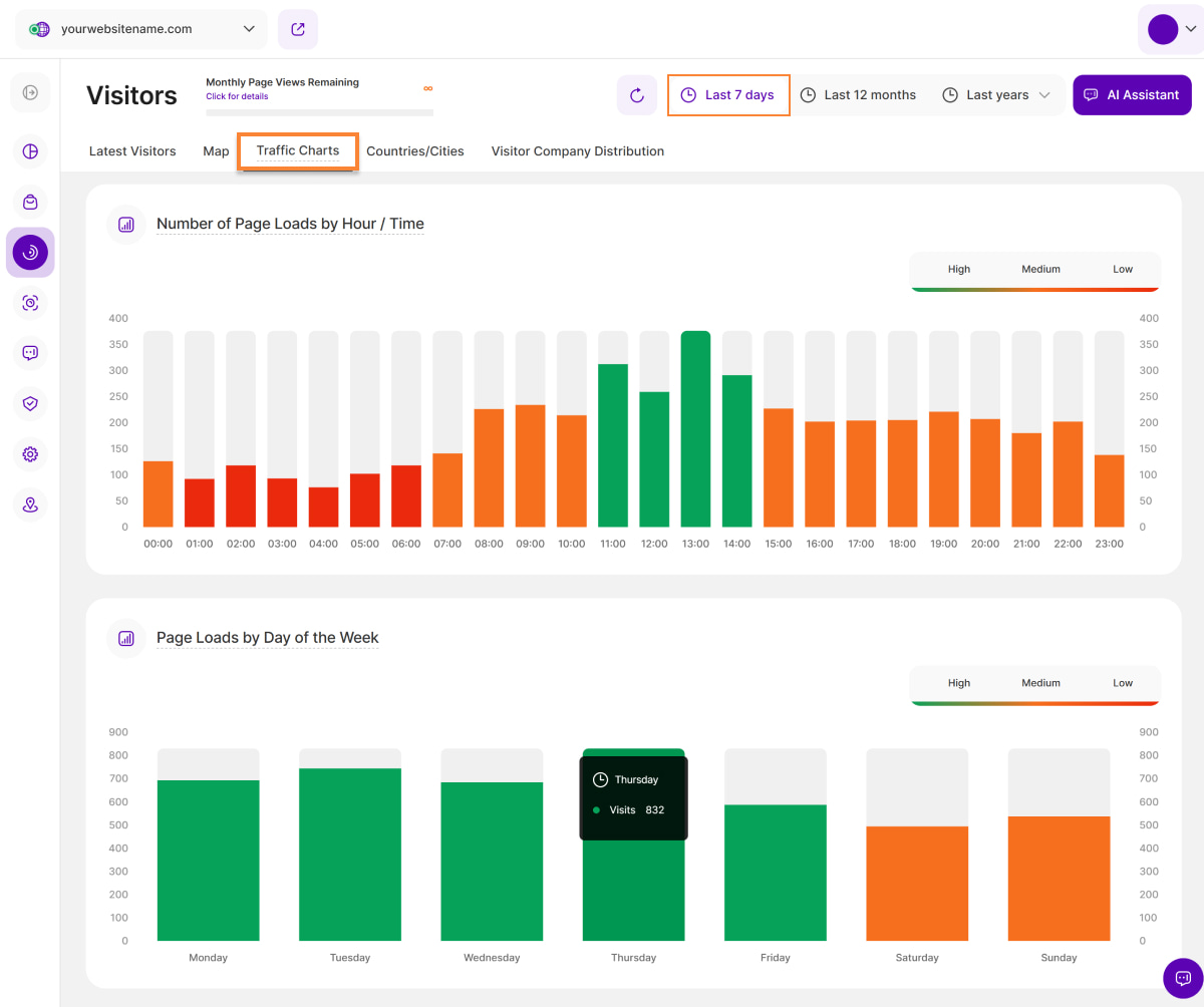 - Orange: Steht für "Mittlerer Traffic" im Vergleich zu Ihrem durchschnittlichen Traffic insgesamt. Es kennzeichnet die Stunden, Tage und Wochen mit mittlerem Traffic auf Ihrer Webseite.