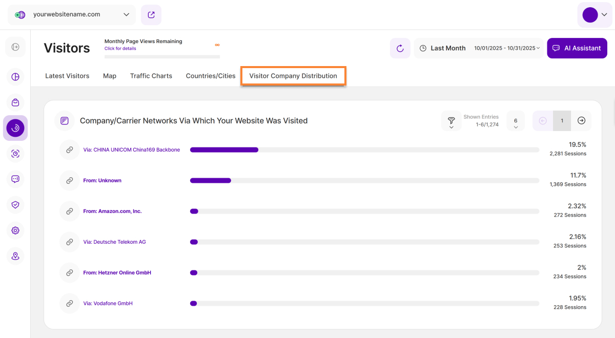 Als Teil der Unternehmensnamen von Besuchern bietet der Tab Verteilung der Besucherunternehmen wertvolle Statistiken und Einblicke in die Unternehmen oder Betreibernetze, die am meisten zum Gesamt-Traffic auf Ihrer Webseite beitragen, basierend auf dem ausgewählten Zeitraum.
