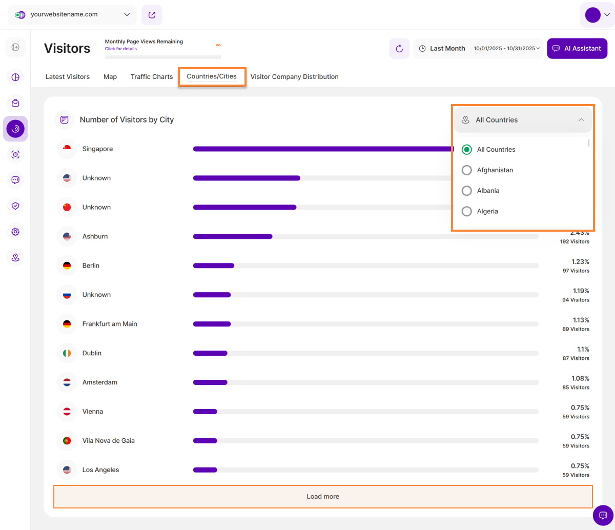 Der zweite Berichtsblock zeigt eine Liste der Städte an, aus denen Ihre Besucher stammen. Rechts oben befindet sich ein Dropdown-Menü, mit dem Sie die Liste nach Ländern filtern können. Auf diese Weise können Sie genauere Daten auf Städtebasis extrahieren.