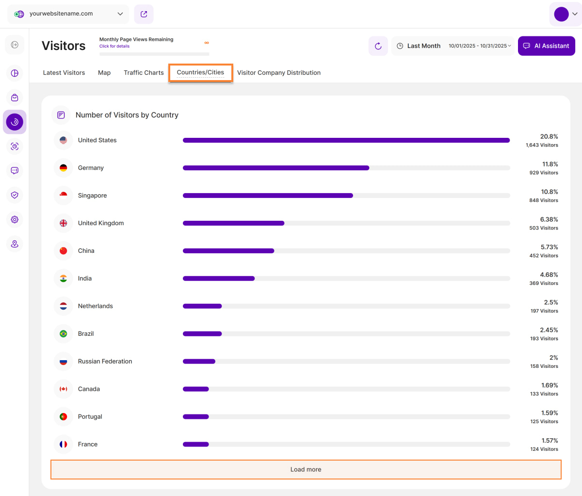 - Prozentsatz: Der neben jedem Balken angezeigte Prozentsatz gibt den Anteil des jeweiligen Landes an der Gesamtzahl der Besucher an und hilft Ihnen, den relativen Beitrag jedes Landes zu Ihrem gesamten Internetverkehr abzuschätzen.
