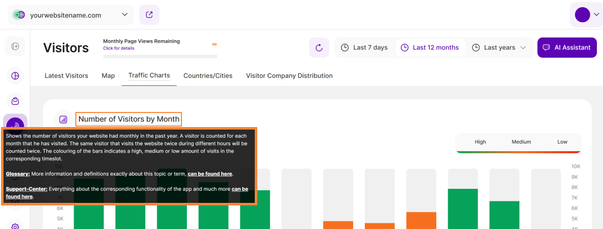 - Anzahl der Seitenaufrufe nach Monat: Zeigt die Anzahl der Seitenaufrufe an, die Ihre Webseite im vergangenen Jahr monatlich hatte. Dies unterstützt die Daten der Grafik "Anzahl der Besucher nach Monat".