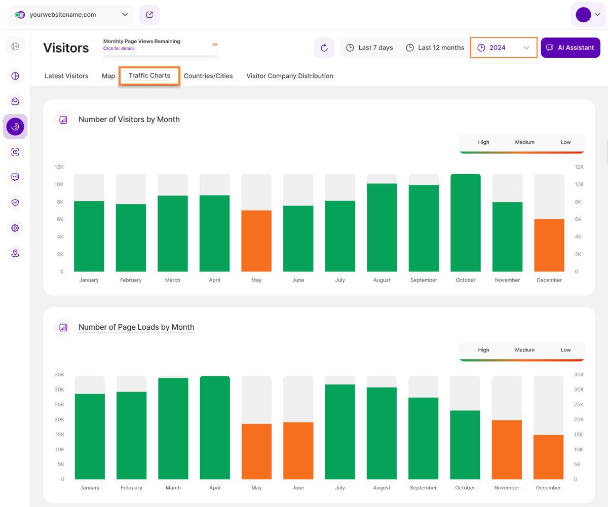 - Anzahl der Seitenaufrufe nach Monat: Zeigt die Anzahl der Seitenaufrufe an, die Ihre Webseite im ausgewählten Jahr monatlich hatte. Dies unterstützt die Daten der Grafik "Anzahl der Besucher nach Monat".
