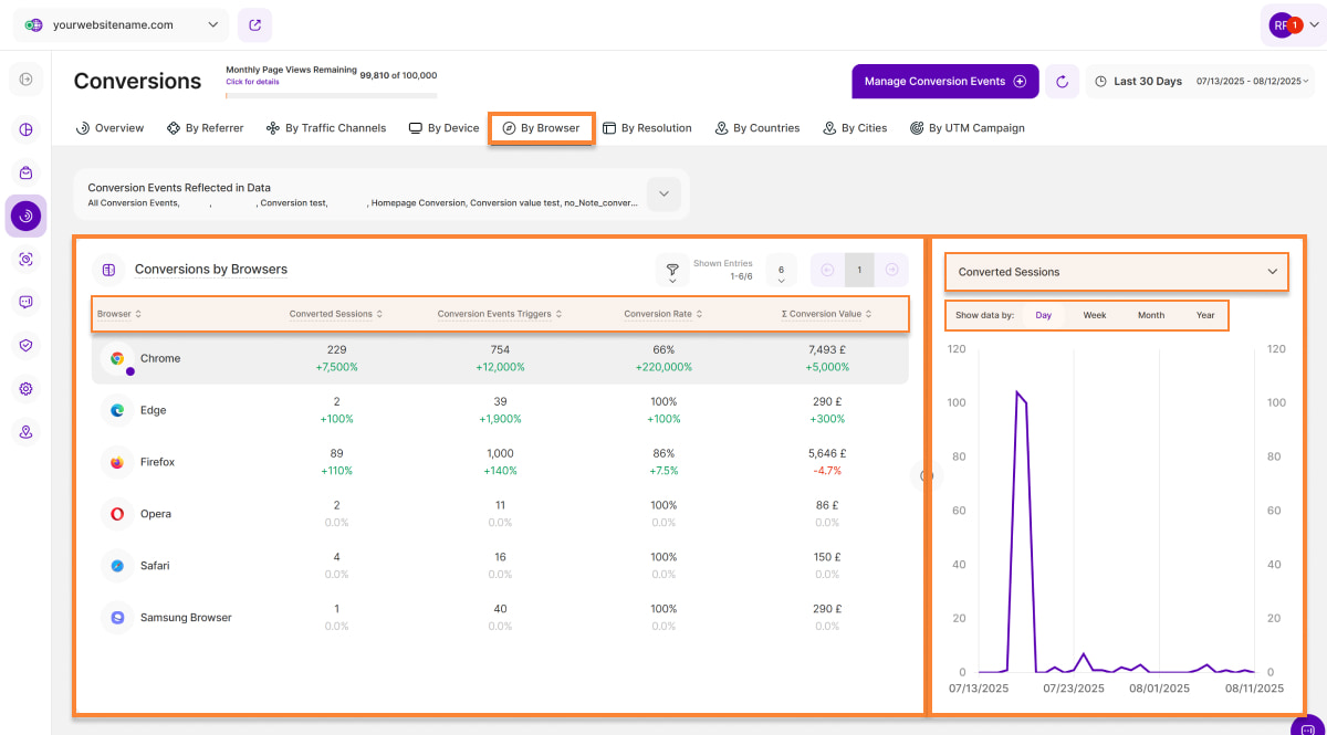 1. Browser: Zeigt alle Browser an, die Sitzungen an die Webseite weitergeleitet haben, die im ausgewählten Zeitraum mindestens ein Konversionsereignis ausgelöst haben. Jedes Browsersymbol hat einen farbigen Punkt in der unteren rechten Ecke, um das Element visuell mit der Linie innerhalb des Liniendiagrammelements auf der rechten Seite zu verbinden.
