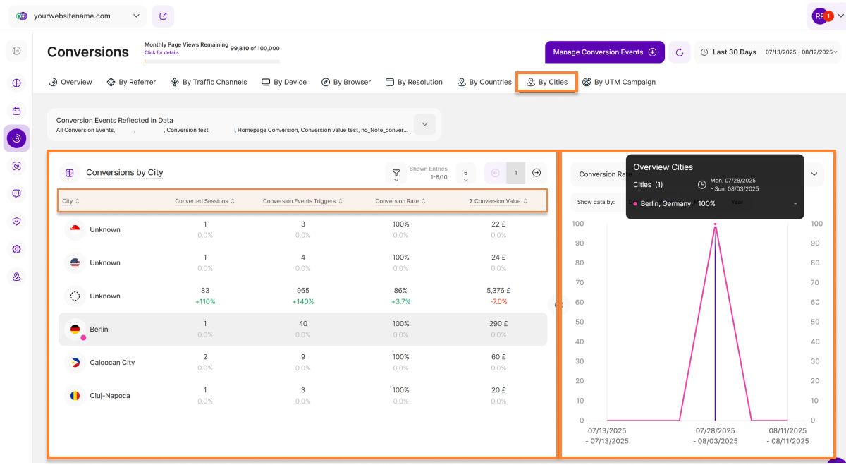 4. Konversionsrate: Die Konversionsrate zeigt Ihnen, wie viel Prozent aller Sitzungen, die Ihre Webseite über eine bestimmte Stadt in einem ausgewählten Zeitraum besucht haben, mindestens ein Konversionsereignis ausgelöst haben.