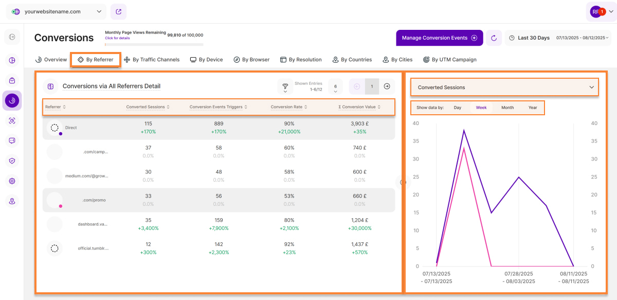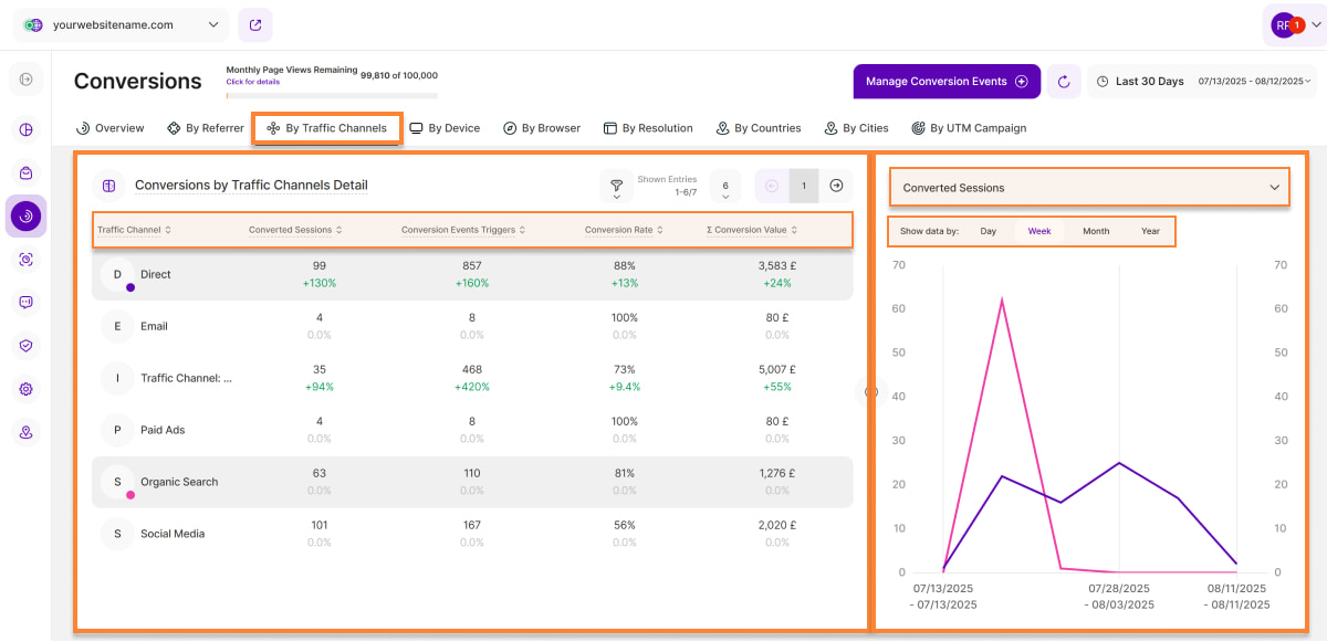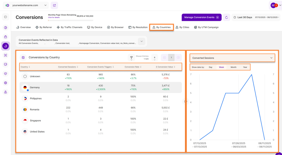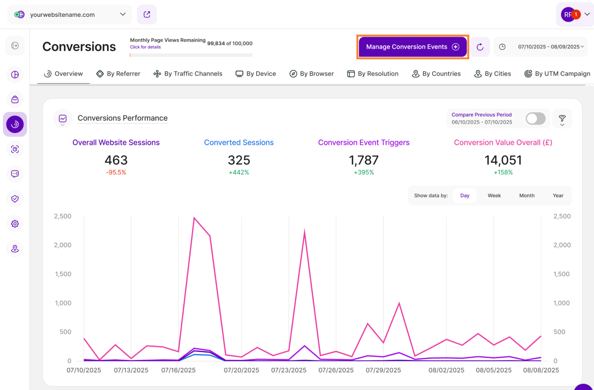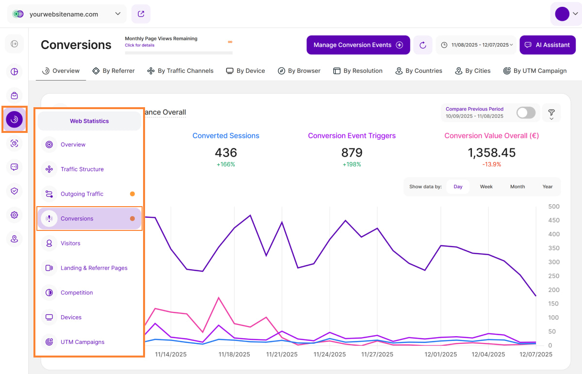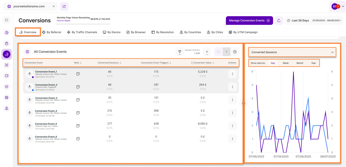 Dieser Berichtsblock enthält standardmäßig ein Liniendiagramm, das die Leistung der gesamten Sitzungen Ihrer Webseite (unabhängig davon, ob eine Sitzung konvertiert wurde oder nicht), die Anzahl der ausgelösten Konversionsereignisse und den im ausgewählten Zeitraum insgesamt generierten Konversionswertvergleicht. Mehr über unsere Datenvisualisierungsoptionen erfahren Siehier. Sie können Conversion-Ereignisse und ihre jeweiligen Werte definieren unter Webseite Einstellungen > Conversions.