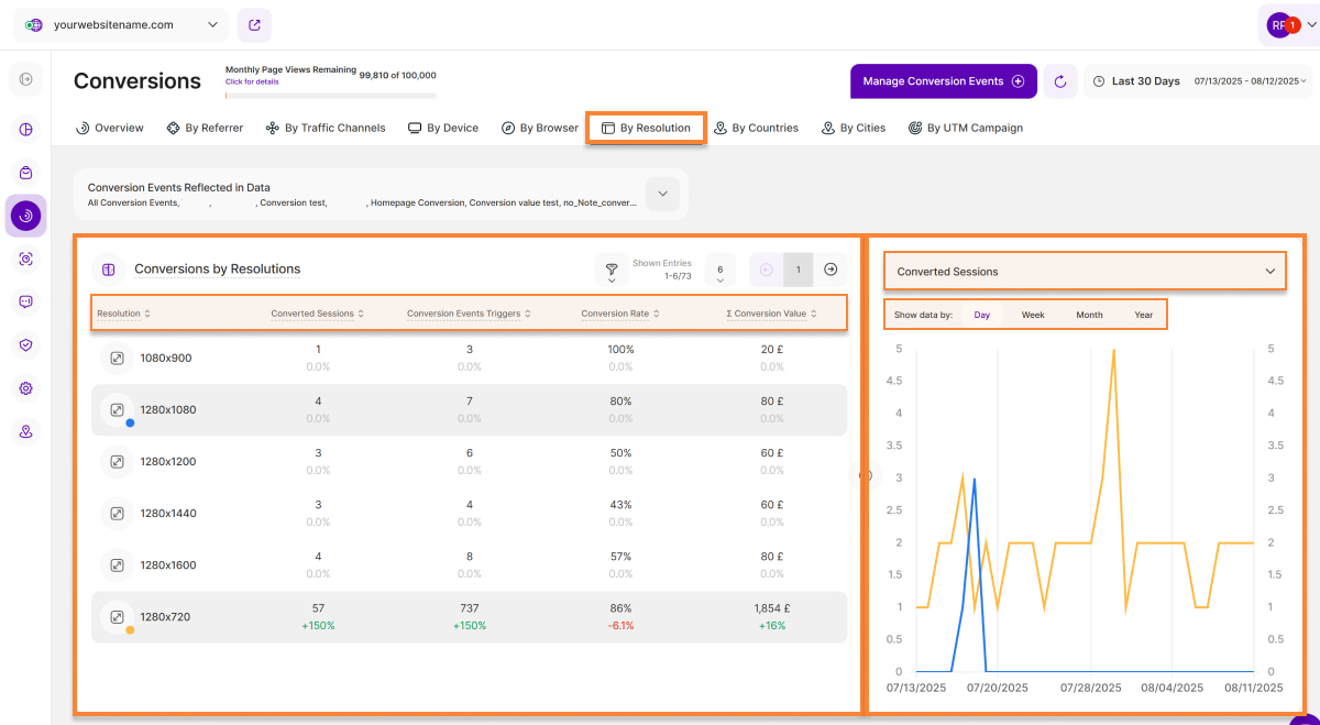Auf dieser Registerkarte wird ein Berichtsblock mit Daten zur Umwandlung nach Auflösungen aus dem von Ihnen ausgewählten Zeitraum angezeigt. Ähnlich wie bei den anderen Registerkarten können Sie über das Dropdown-Menü "In Daten reflektierte Konvertierungsereignisse" festlegen, welche Ereignisse im Bericht angezeigt werden.