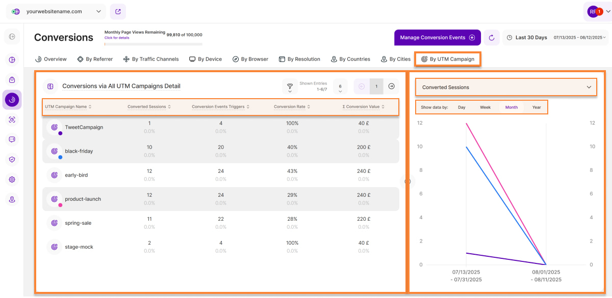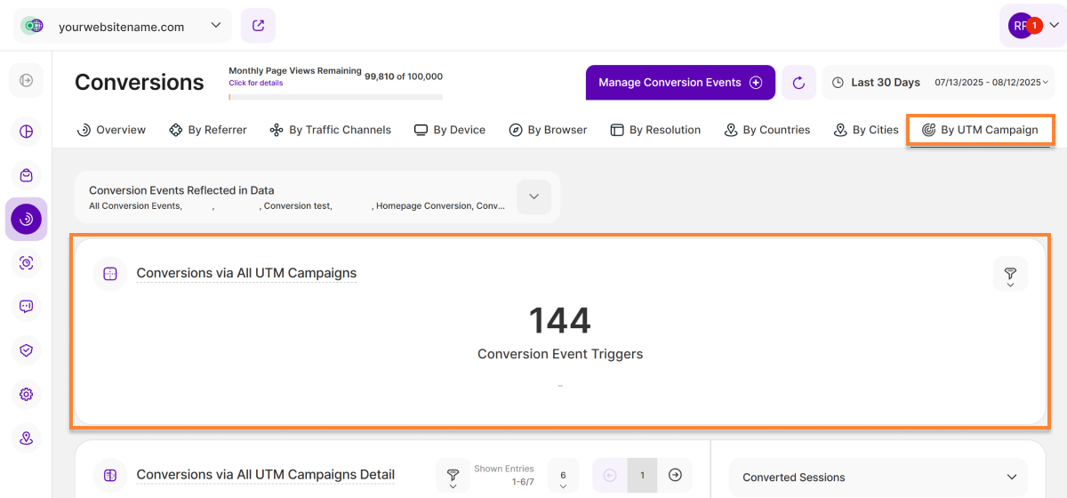 Dieser Bericht zeigt Ihnen die Anzahl der ausgelösten Konversionsereignisse durch Sitzungen, die über eine beliebige UTM-Kampagne auf Ihre Webseite gelangen. Er hilft Ihnen zu verstehen, welche UTM-Kampagnen den größten Konversionswert erzeugen. Der KPI zeigt auch einen prozentualen Vergleich an.