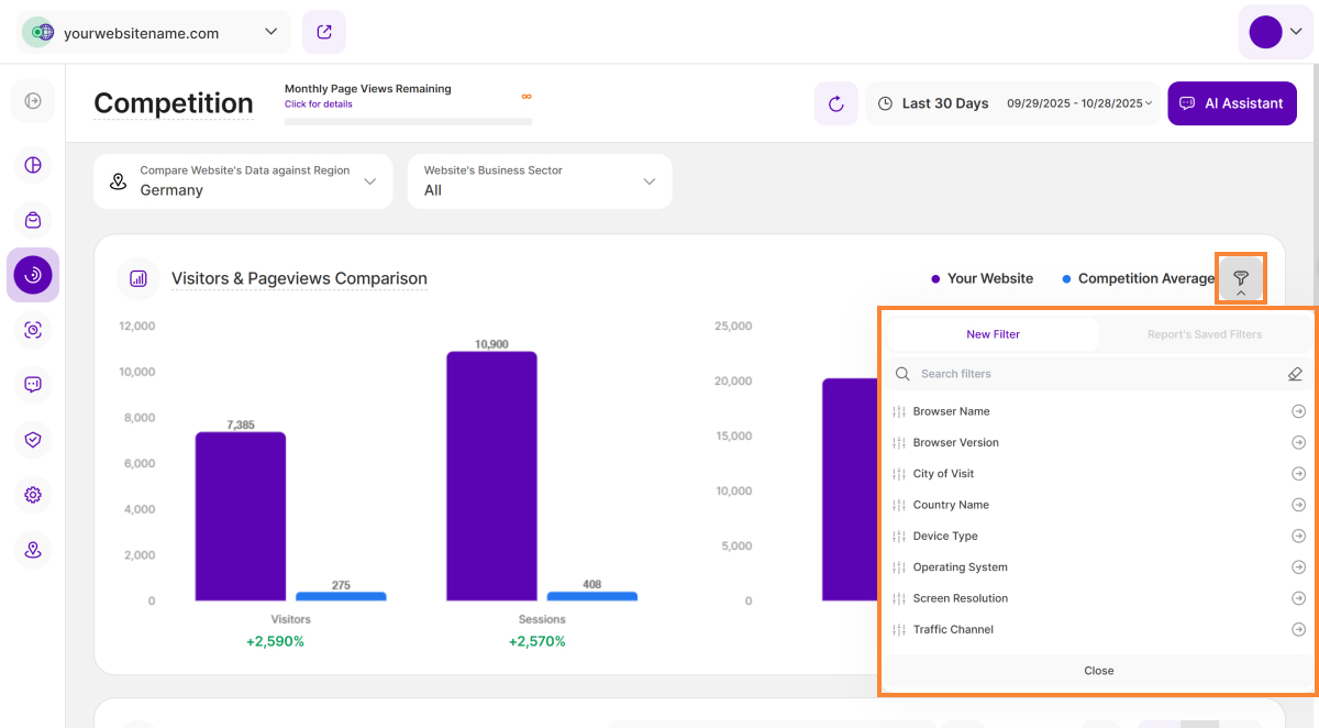 Das Submodul Wettbewerb bietet unschätzbare Einblicke, und Filter sind der Schlüssel zu einem detaillierten Verständnis Ihrer Leistung. Sie sind durchgängig in allen Berichtsblöcken verfügbar und geben Ihnen die Möglichkeit, einen oder mehrere auf einmal anzuwenden, um die Daten Ihrer Webseite mit hoher Präzision zu segmentieren und zu analysieren.