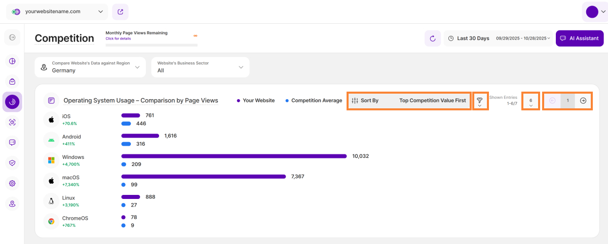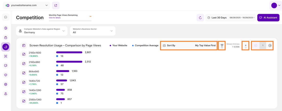 Um Ihre Analyse zu fokussieren, sortieren Sie die Daten, um entweder Ihre Top-Werte oder die Top-Werte der Konkurrenz zu priorisieren. Sie können die Daten auch filtern, um sie für einen Wettbewerbsvorteil zu segmentieren. Schließlich können Sie Ihre Ansicht verwalten, indem Sie die Anzahl der Einträge pro Seite festlegen und mit der Paginierung navigieren.