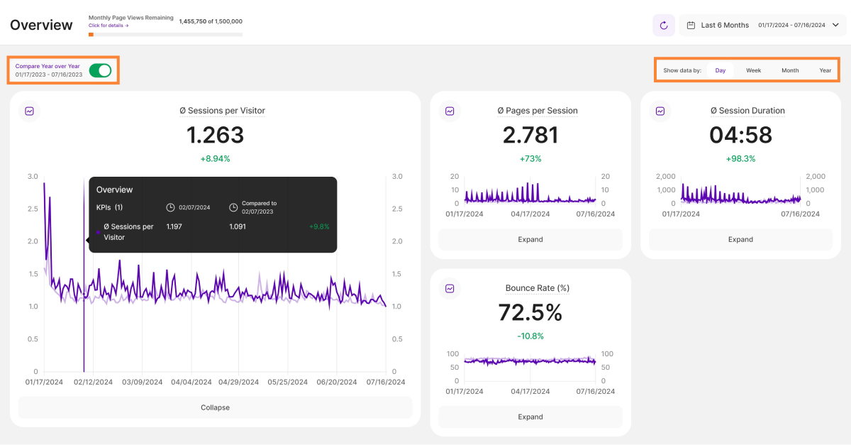 Mit dieser Funktion erhalten Sie einen klaren Überblick über Ihre aktuellen Daten im Vergleich zum vorherigen entsprechenden Zeitraum oder Jahr. So können Sie die Entwicklung Ihrer KPIs im Laufe der Zeit verfolgen. Die Linien in helleren Farbtönen stellen die Daten des vorangegangenen Zeitraums oder Jahres dar. Wenn Sie mit dem Mauszeiger über diese Linien fahren, erhalten Sie zusätzliche Informationen.