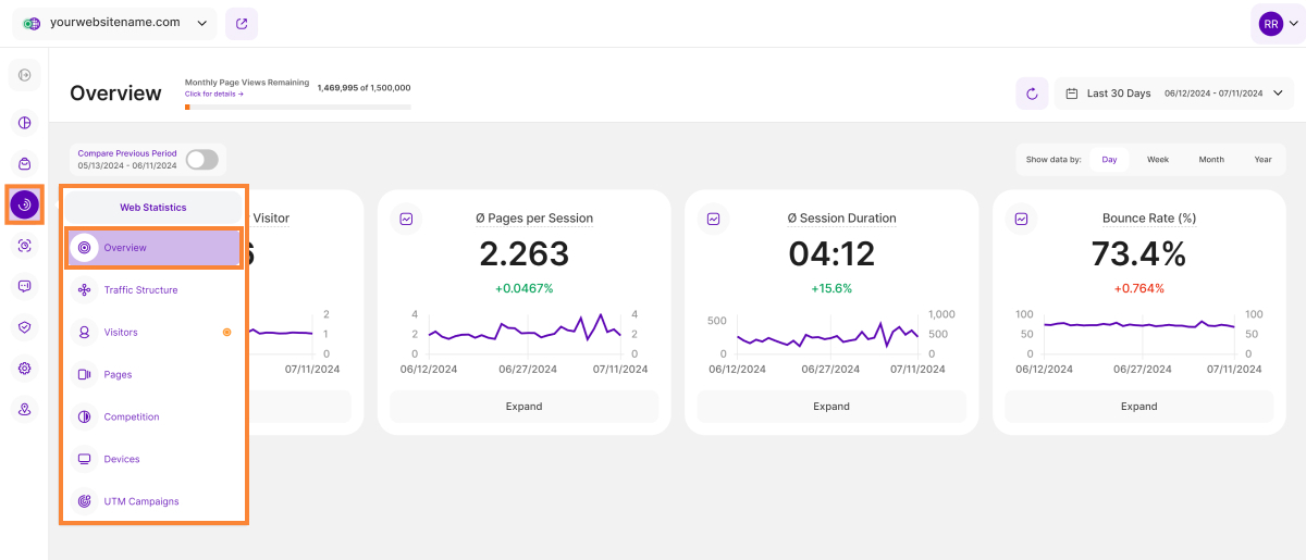 Der Traffic ist die Seele Ihrer Webseite. Wenn es Besucher gibt, wird es auch Kunden geben. Anhand dieser Informationen können Sie überprüfen, wie die Leistung Ihrer Webseite auf die von Ihnen durchgeführten Maßnahmen reagiert hat. Wir haben vier KPIs in diesem Berichtsblock: