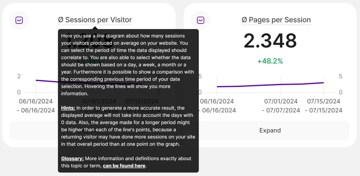 - Sitzungen pro Besucher: Zeigt an, wie viele Sitzungen Ihre Besucher im ausgewählten Zeitraum durchschnittlich auf Ihrer Webseite durchgeführt haben.