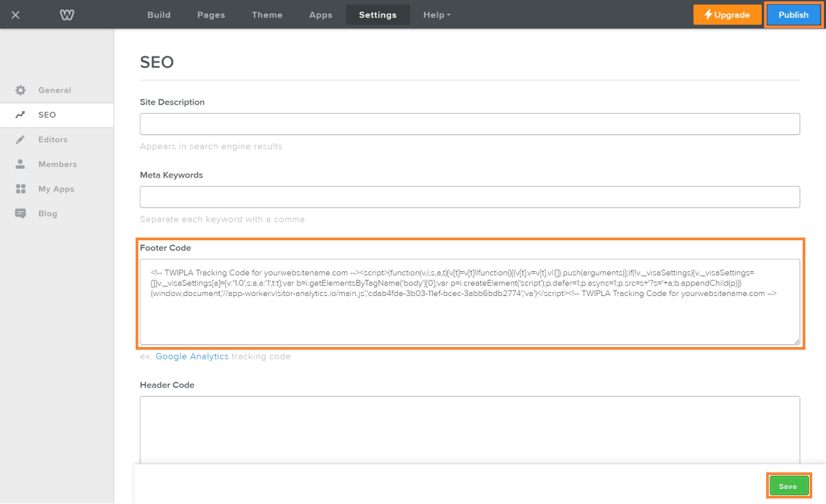 13. fügen Sie Ihren Tracking-Code in das Feld Footer-Code ein und klicken Sie auf Speichern. Veröffentlichen Sie Ihre Website.
