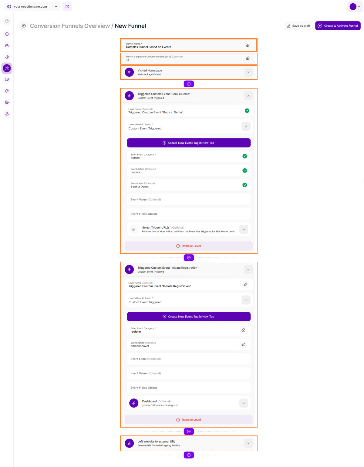 - Left website to external URL: This final level tracks visitors who navigated to a specific external URL after engaging with the demo booking and registration processes. Utilizing the External URL Visited (Outgoing Traffic) base criterion with the target URL defined, this step is crucial for understanding the broader conversion journey and its relation to your primary goals (like demo bookings or registrations).