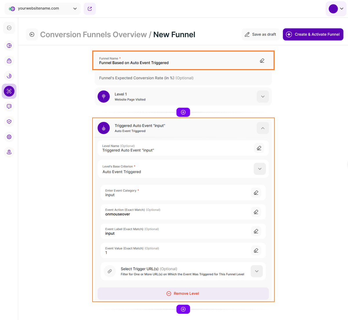 The last available base criterion is Auto Event Triggered, which enables the definition of funnel levels based on auto-tracked events. Similar to Custom Event Triggered, this provides deep insights into visitor engagement by automatically tracking actions like form interactions, button clicks, and more, without requiring manual setup.