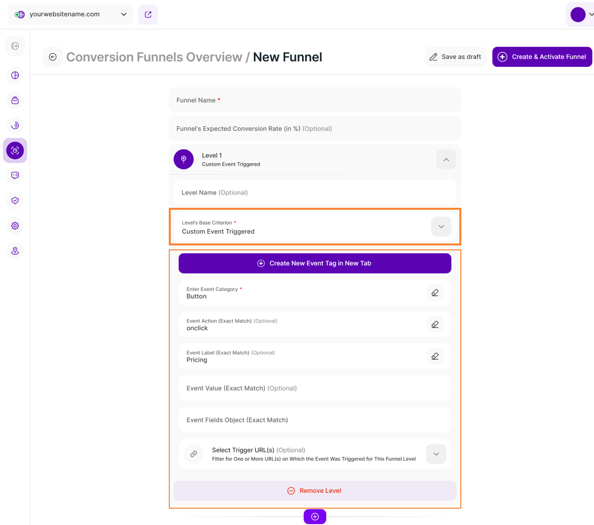 - Select Trigger URL(s) (Optional): While custom events track actions regardless of the page, you can optionally narrow down the scope of this funnel level to specific URLs where the event might occur.