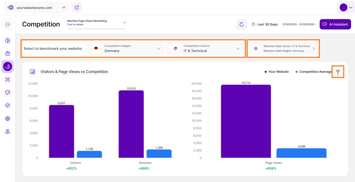 In the Competition submodule, you can compare your own website’s performance data against the respective averages generated by competing websites of a region and business sector you can select.