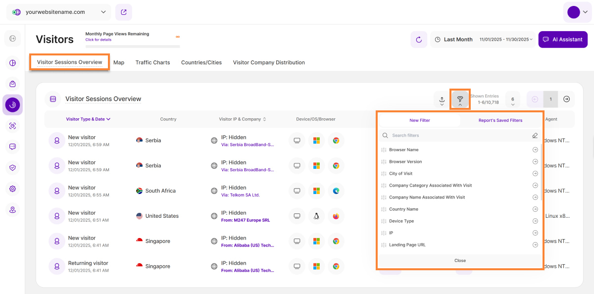 The Visitor Sessions Overview report block now features expanded filtering capabilities designed to empower you with greater control and deliver truly deeper insights. You can apply a wide range of filters, individually or in combination, and easily save these powerful configurations as custom templates for subsequent use.
